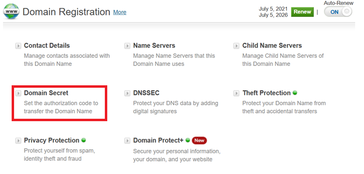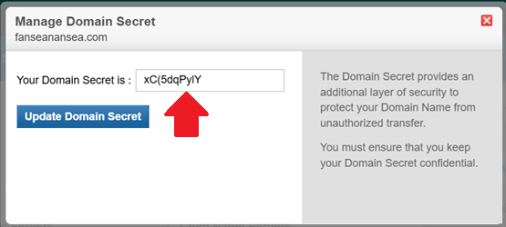 STEP 8: Copy the DOMAIN SECRET (AUTH CODE). Your new domain registrar will ask for this when transferring the domain to them.